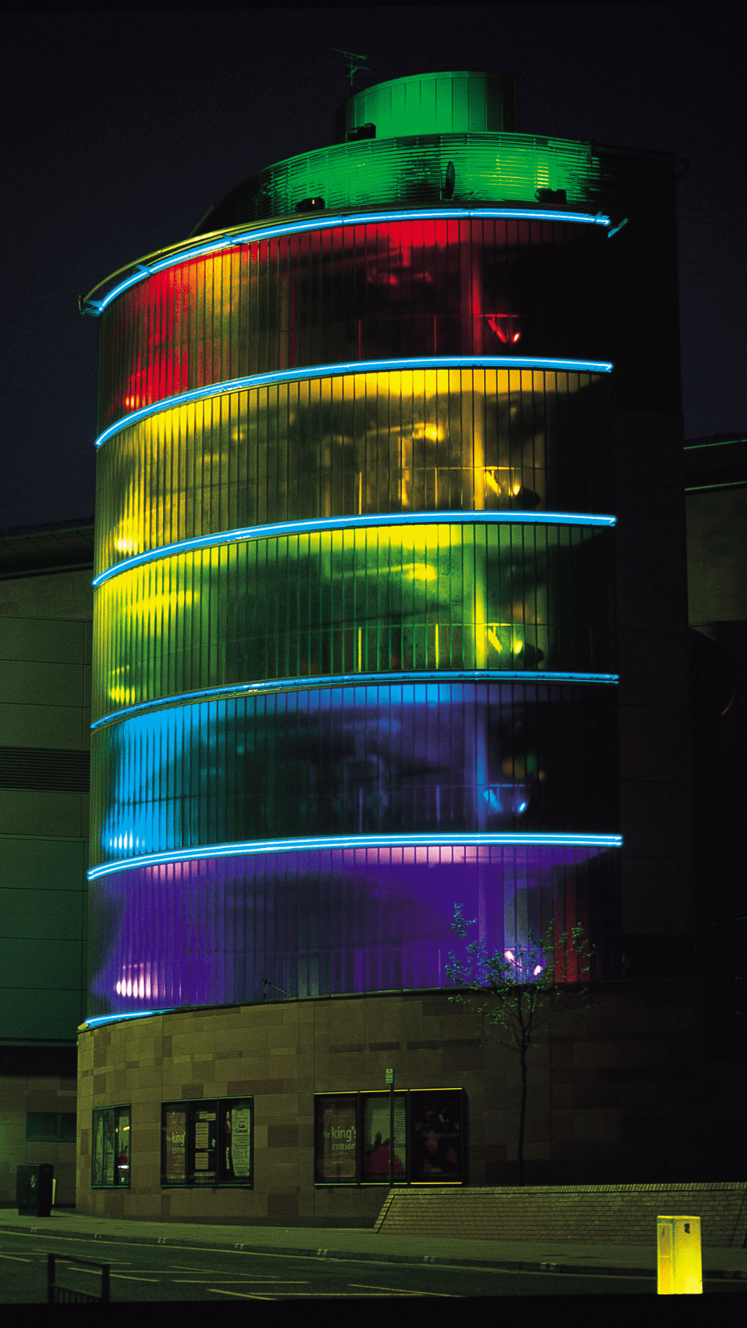 The installation has since been decommissioned, and the tower now stands unlit. But for those who saw it in its full nocturnal glory, the Tower of Time remains a memorable part of The Bridgewater Hall’s early years – a playful, ever-changing companion to the music performed inside.