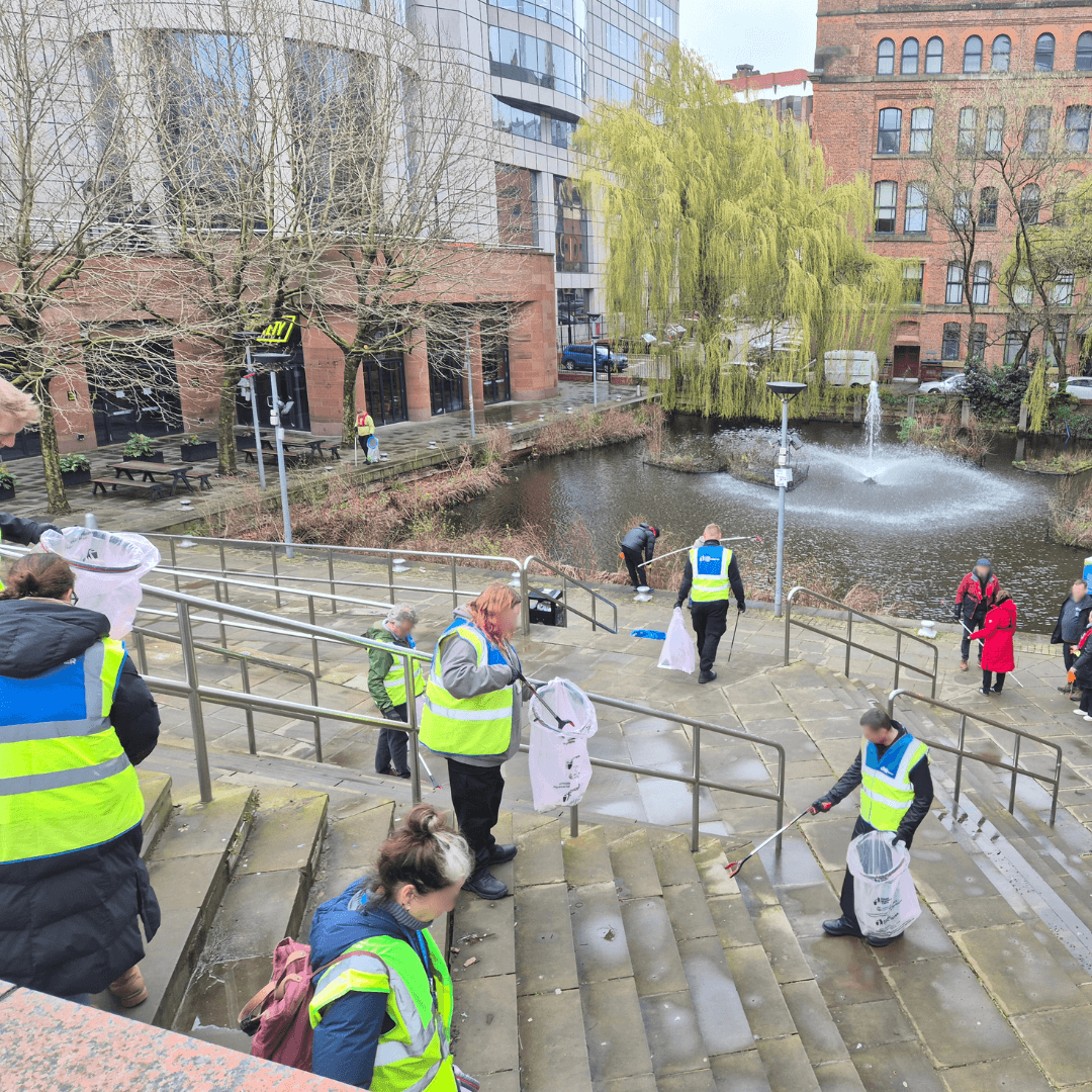 Alongside this transformation, the Basin is cared for through regular monthly Canal Basin litter picks, bringing together staff from The Bridgewater Hall, local businesses, Manchester City Council, and the Canal & River Trust to work collaboratively to keep this important waterside space clean, welcoming, and well maintained.
