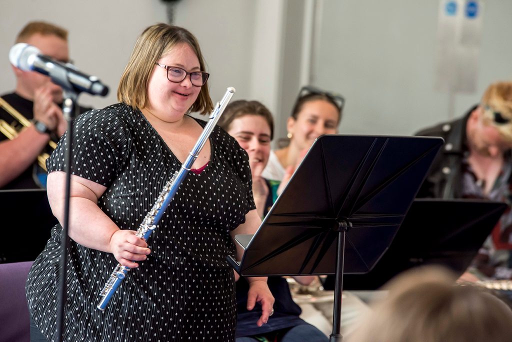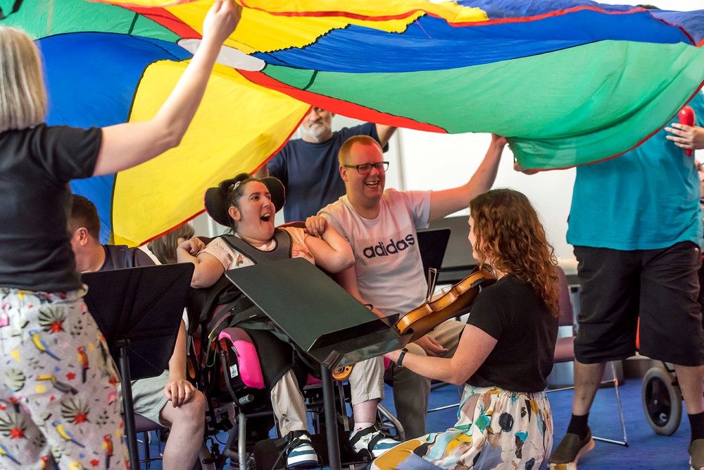 In June, we held the sharing event for Be Hear Now in the Community, the culmination of monthly sessions we have delivered with PossAbilities, a day centre for adults with learning disabilities in Rochdale. The event was led by leaders Beth Bishop and Alice Phelps, and featured performances by PossAbilities, including ‘Jennifer’s Song’ which they had written themselves, as well as students from Heatons School and OMNI Music. Special Virtuosi, an ensemble for SEND young people delivered by the RNCM, also gave brilliant solo and group performances. The group is now preparing for a special interactive workshop on Friday 9 August, as part of The Royal Exchange’s annual community event – The FestiDale in The Den! We’d love to see you there.