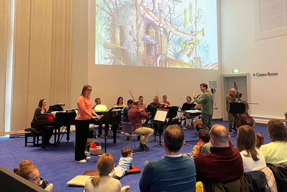 On Saturday 23 March we welcomed the lovely Opera North to the Hall for a family concert in the Barbirolli Room! In this relaxed concert children were entertained to a musical story about Dizzy the Duck with No Luck. The show had plenty of sing-along opportunities for children and parents alike and featured beautiful musical accompaniment from the Orchestra of Opera North, with music composed by Paul Rissman. After the show, families got the chance to meet the members of the orchestra, and have a look at lots of different instruments, ranging from double basses to French horns. We also saw the return of our popular Instrument Petting Zoo with Sarah, Grace, and Jess.